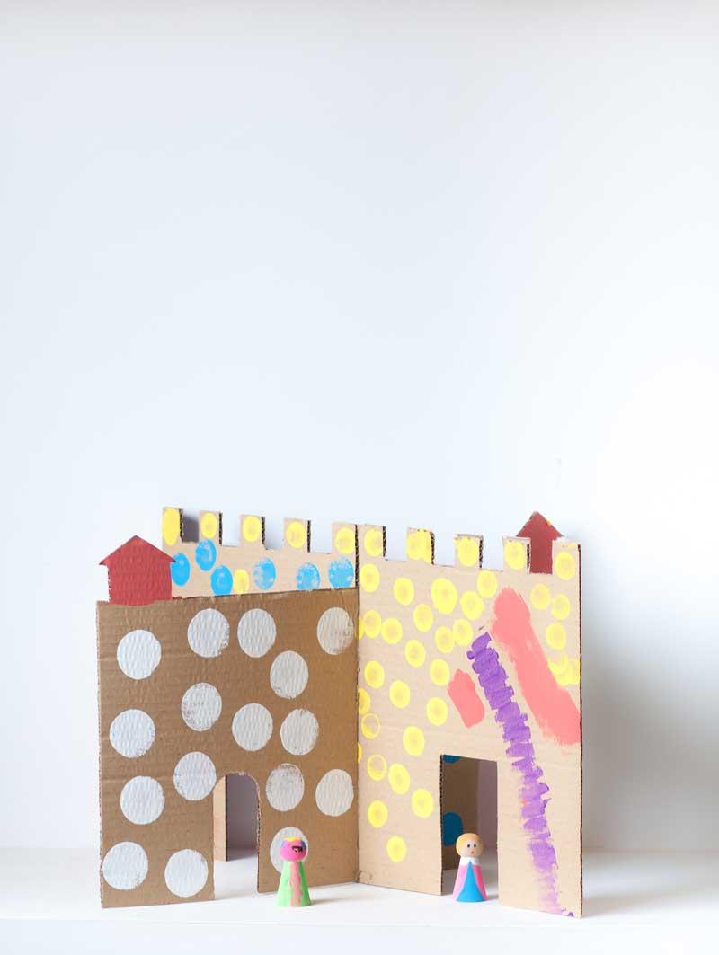 Lo primero que tendremos que hacer es darle forma a los trozos de cartón, en mi caso les he dado forma de castillo pero puedes hacerlo como quieras, después tu peque lo convertirá en lo que él o ella quiera. Fíjate muy bien en los cortes que le he hecho a cada trozo de cartón justo en el medio. Estos son los que unirán los dos trozos y harán posible que el castillo se quede en pie.