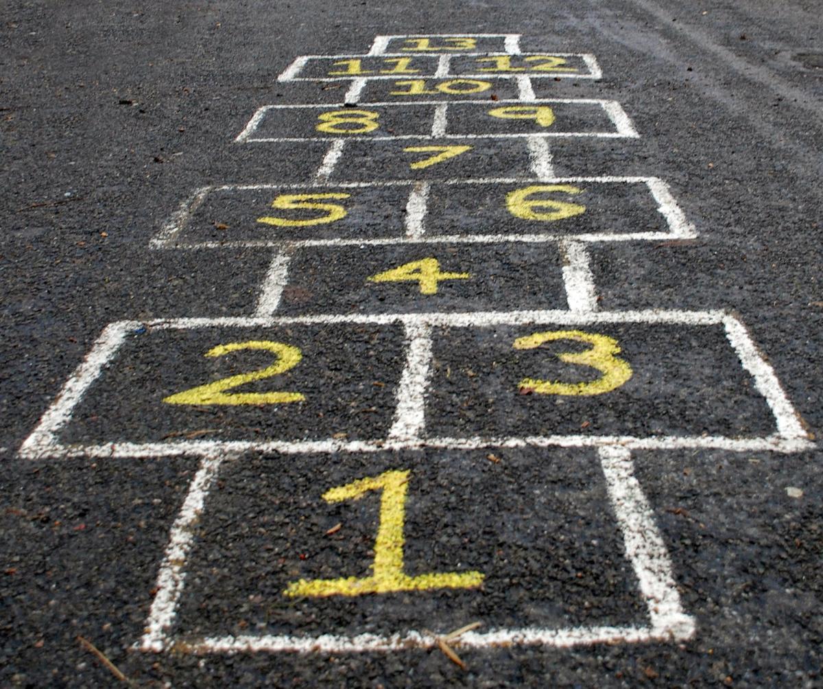 Con cinta de carrocero dibujaremos en el suelo del pasillo el terreno de juego. Un peluche hará las veces de piedra. Cada jugador hará el circuito saltando a la pata coja en los cuadrados, o con los dos pies si se trata de un cuadrado doble. El cuadrado en el que caiga el peluche será “casa” y no se puede pisar.