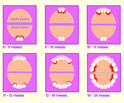 Los primeros dientes que salen son los que llamamos "las paletas", suelen salir antes las de abajo y luego las de arriba. Luego van saliendo los dientes de los laterales hasta tener las 20 piezas de leche, más o menos a los 2 años. Estos dientes se conservaran hasta los 6 años que comiencen a mudarse.