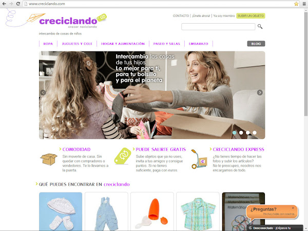 Hoy quiero hablaros de Creciclando, un proyecto que me llamó la atención nada más saber de el.... Se trata de una web que fomenta el reciclaje a través del intercambio de cosas de niños, puedes encontrar de todo (sillas, ropa, calientabiberones, robots, libros... ), una idea sin duda para plantar cara a la crisis ! ; )
