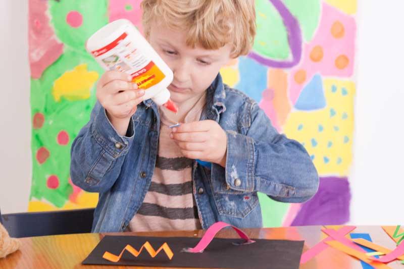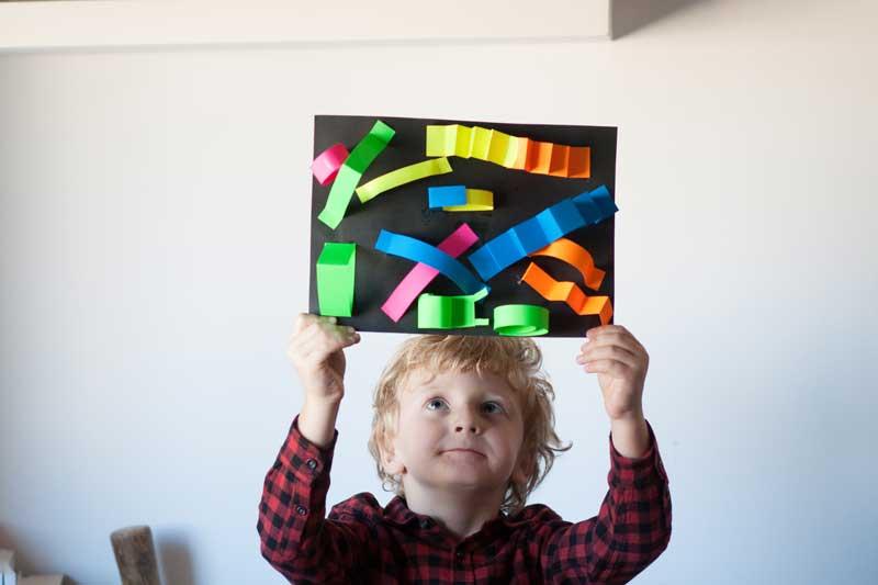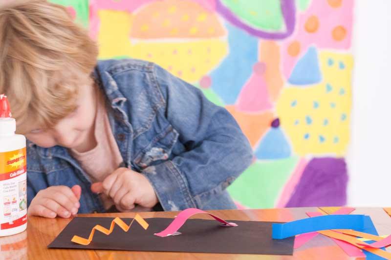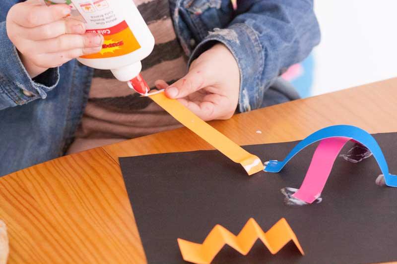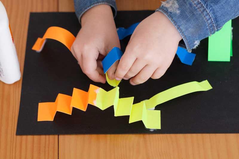 Cuando tengáis unas cuantas tiras de diferentes colores cortadas ya podréis animar a vuestro peque a que empiece a crear. Para ello coged una tira y explicadle que podría hacer con ella y como pegarla a la base (será la cartulina negra). Yo elegí hacer una escalera doblando la tira entera y pegando sobre la cartulina blanca uno de los extremos.