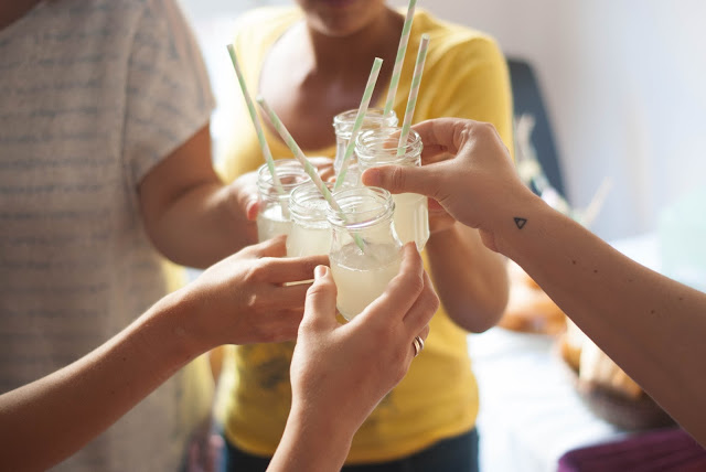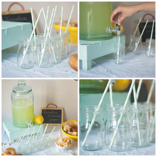 Fíjate si está preparada que tiene hasta un dispensador de bebidas. ¿Y que bebimos? Limonada, of course. Tarros de cristal reciclados, la opción mas bonita para usar de vaso.