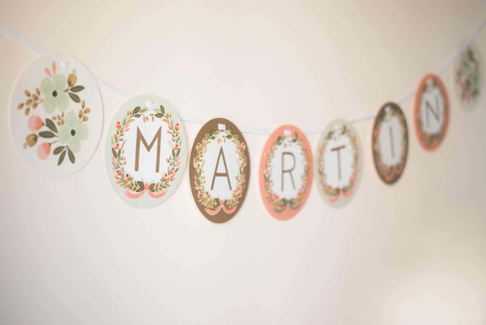 Muy importante tener banner de letras en casa. Te sacan de muchos apuros. Oli tiene unos negros, otros en tonos pastel y estos de Rifle Paper Co que fueron los elegidos en esta ocasión. Yo tengo unos de colores, que aunque algo mas infantiles, son también una monada.