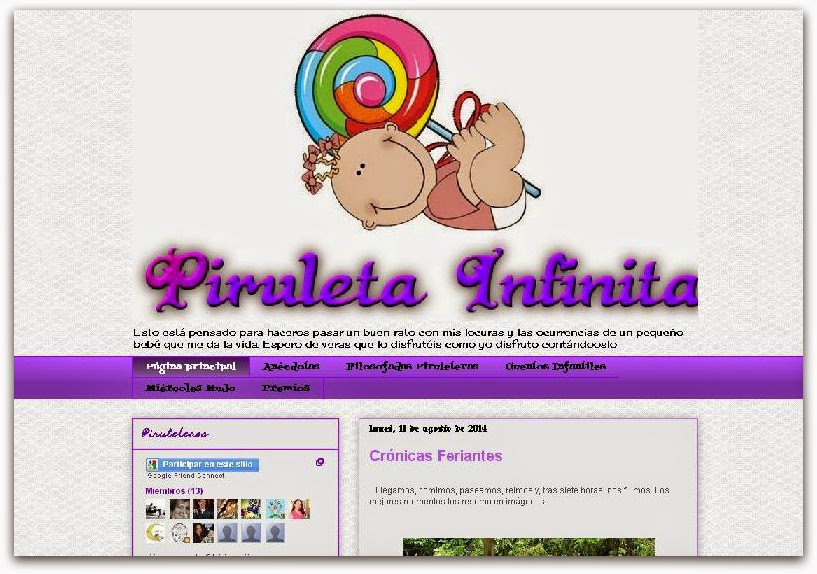 Piruleta Infinita, es uno de los primeros blogs que me engancharon desde antes de tener mi propio blog. Me encanta la creatividad y alegría que Clara le imprime a cada uno de sus relatos cotidianos y sus cuentos. Su carnaval "Lunes de Sueños" da rienda suelta a su creatividad. Es un blog que te sacará una sonrisa sí o sí.
