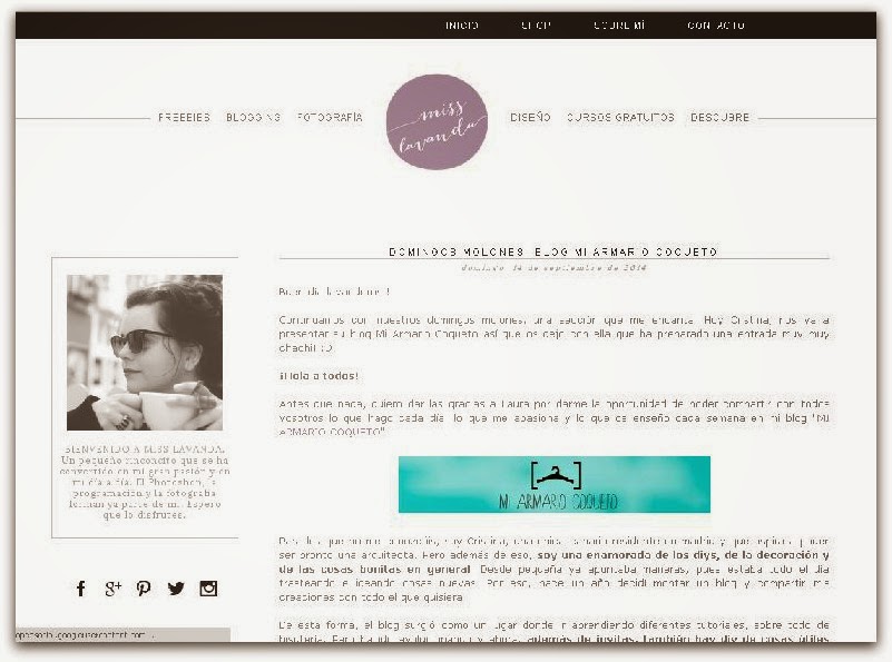 Miss Lavanda, es un blog realmente útil si eres bloguer@ o no, posee tutoriales, recursos y consejos sobre fotografía, blogging y diseño gráfico, presentados por Laura, su autora, de una forma tan cálida, clara y sencilla que además de ayudar te motiva. Y es tan linda Laura, que siempre tiene regalitos para todos los que visitan y siguen su blog.