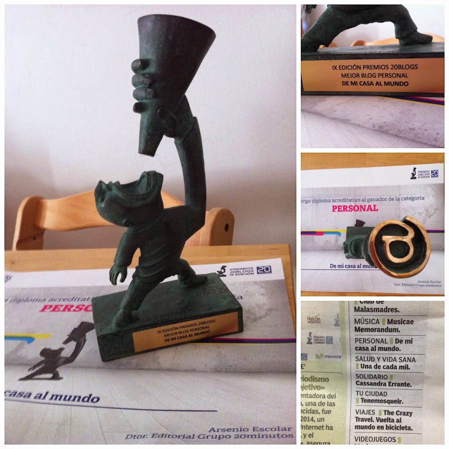 Cuando De mi casa al mundo apareció en la lista de finalistas de la IX edición de los premios 20 blogs que organiza el diario 20 minutos, recibí la noticia ojiplática, con mucha alegría, dando saltitos por la casa y persiguiendo a Chicosolitario, que no se lo creía.