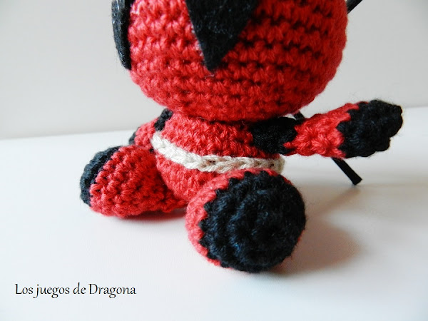 Como siempre, siguiendo el patrón de los conejitos kawaii, he hecho la cabeza, cuerpo, brazos y piernas. El cinturón es una cadeneta cosida al cuerpo, y las dos katanas no son más que un palo de pinchitos partido por la mitad, pintado de negro y cosido a la espalda. Los ojos de fieltro negro y blanco ¡y listo! más sencillito imposible. Y el resultado, otro achuchable superhéroe para la colección que le estoy creando (muy poquito a poco) a papá.
