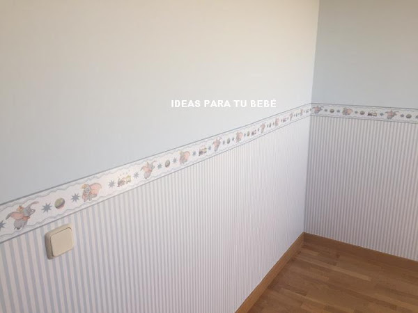 Carlos nos muestra que ha pintado la parte de arriba de la pared en blanco y abajo ha colocado papel pintado con rayas celestes y blancas, quedando tal como muestra la foto. Carlos te ha quedado preciosa la habitación. Un saludo