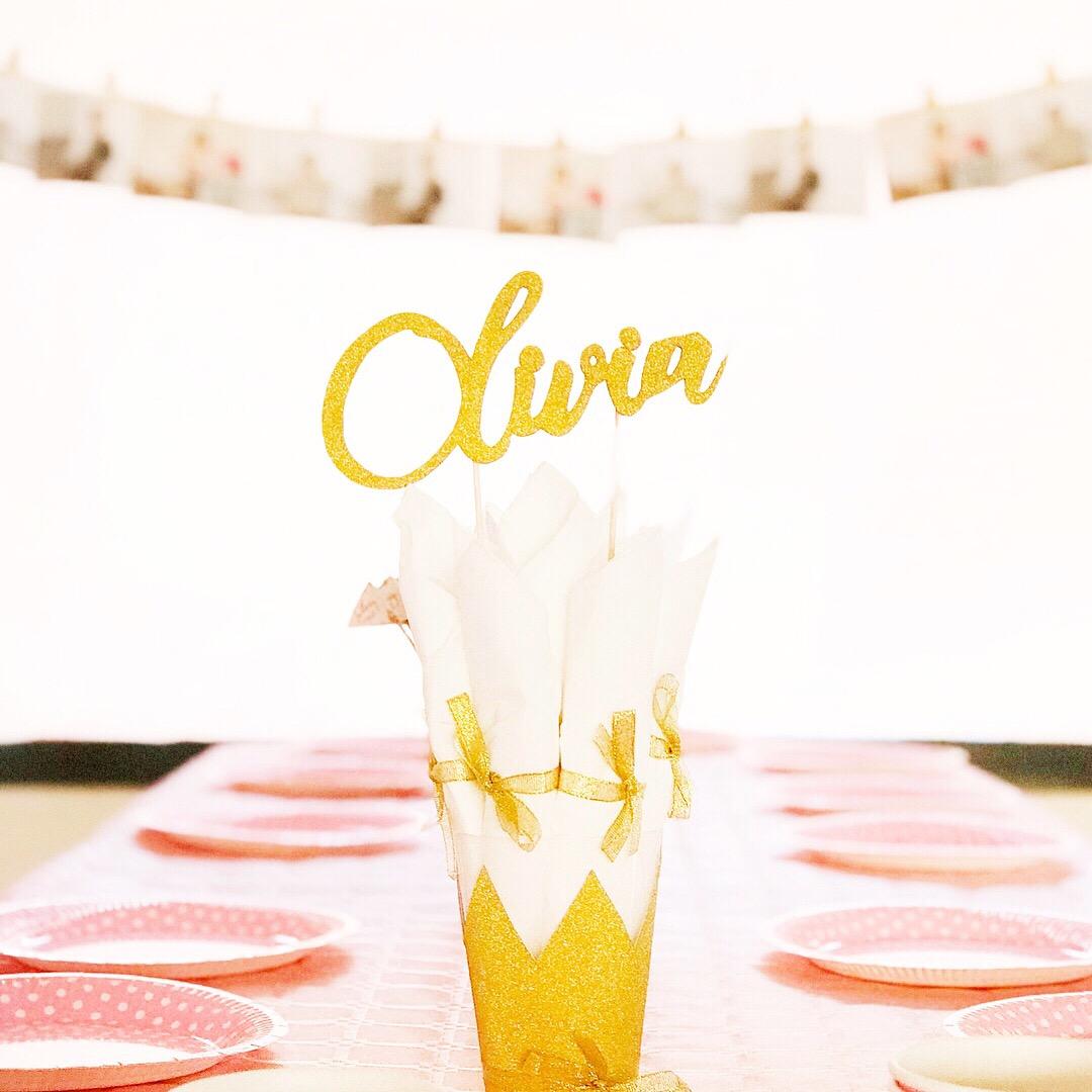 Por último, tenía pensado comprar un cake topper con el nombre de Olivia, pero para no variar, me pillo el toro. Así que lo hice yo, con cuidado y paciencia. Creo que el resultado fue más que aceptable (Modestia, ¿dónde estas?).