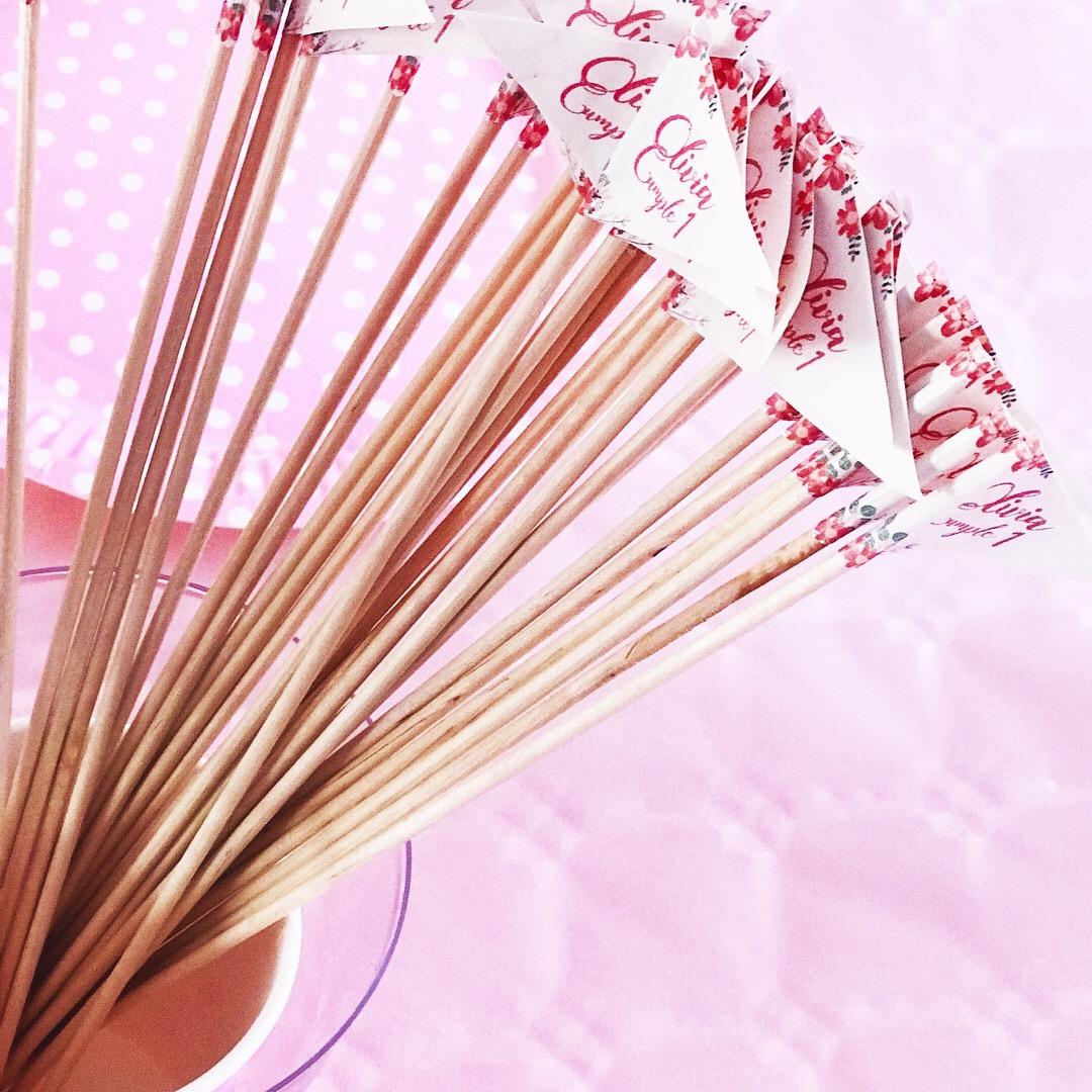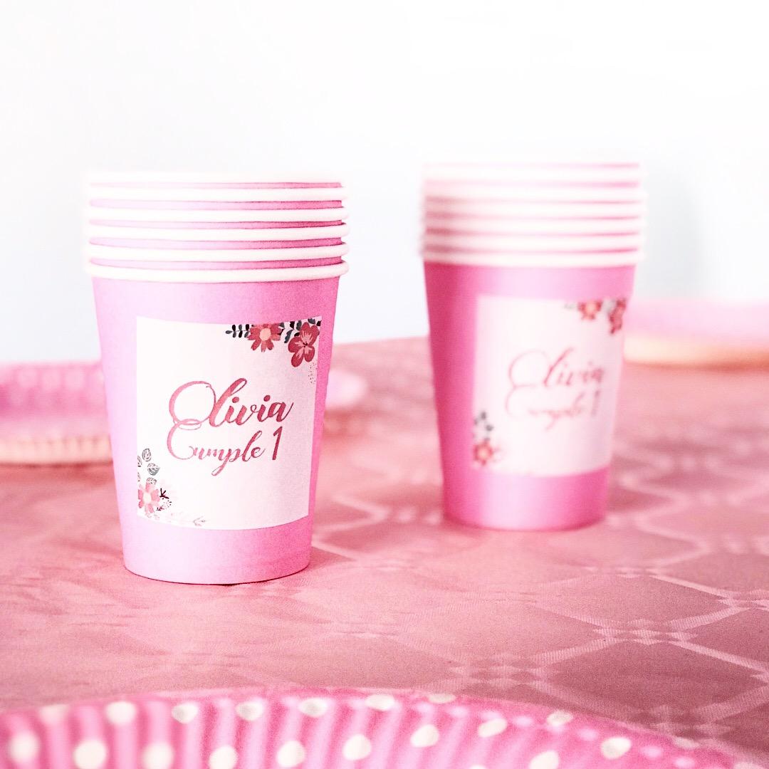 Diseñé una flores y una especie de “logo” que decía “Olivia cumple 1”. Con esos dos motivos diseñé los banderines, las pegatinas para los vasos y los recordatorios. Recorte cada papelito de los banderines y los fui pegando a los palitos. Recorte con un cúter y mucho cuidado cada “pegatina de los vasos” y las fui pegando una a una. Con los cubiertos, finalmente hice una especie de centros con unos lazos y algo de cartulina que quedaron bastante apañados.