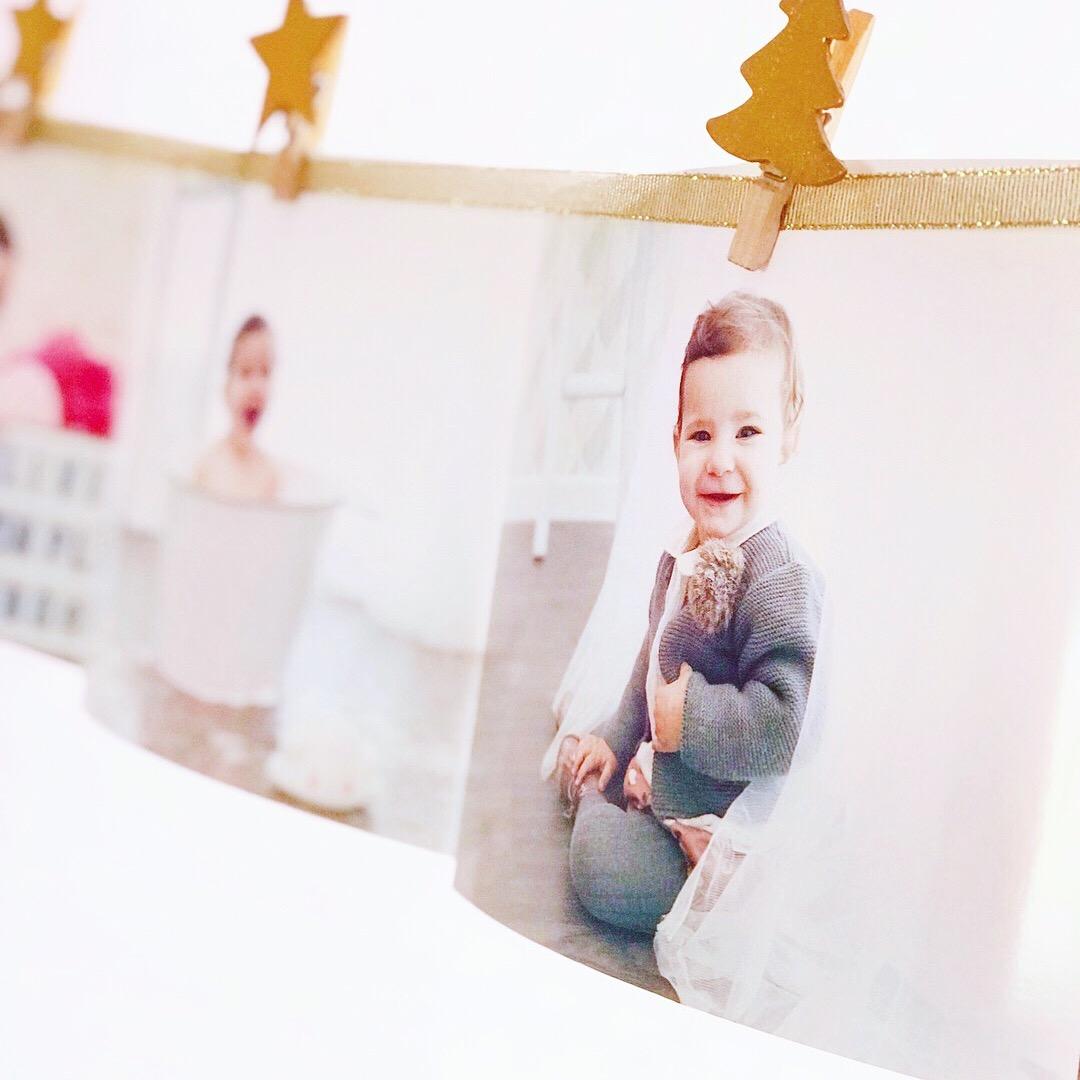 Para la última parte de la decoración y a modo de regalo para nuestros invitados, decidimos imprimir unas fotos y colgarlas en una cinta dorada con unas pequeñas pinzas. Buscar decoración para cumpleaños en diciembre puede hacer que en tu decoración haya un pequeño toque navideño y así paso con las pinzas, que tenían estrellas y abetos.