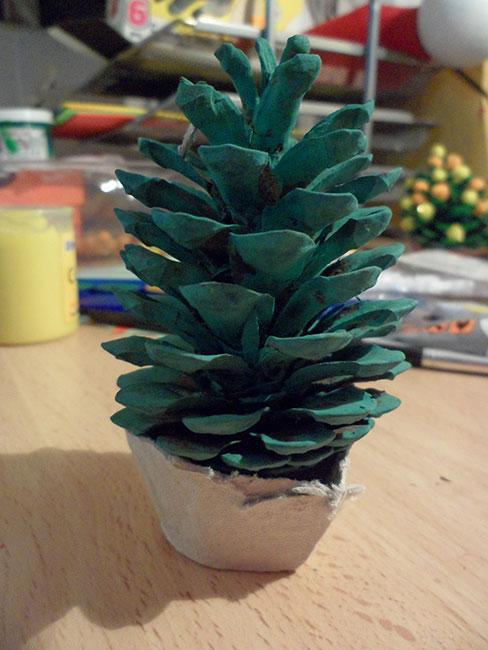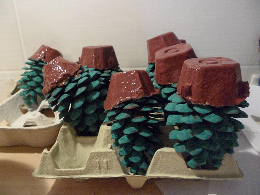 Como véis, las propias bases de hueveras también sirven como base para secar las piezas. Cuando estuvieron secas, terminé de fijar bien la base a la piña por medio de cola blanca, que se vuelve transparente.