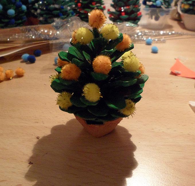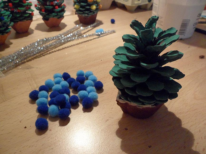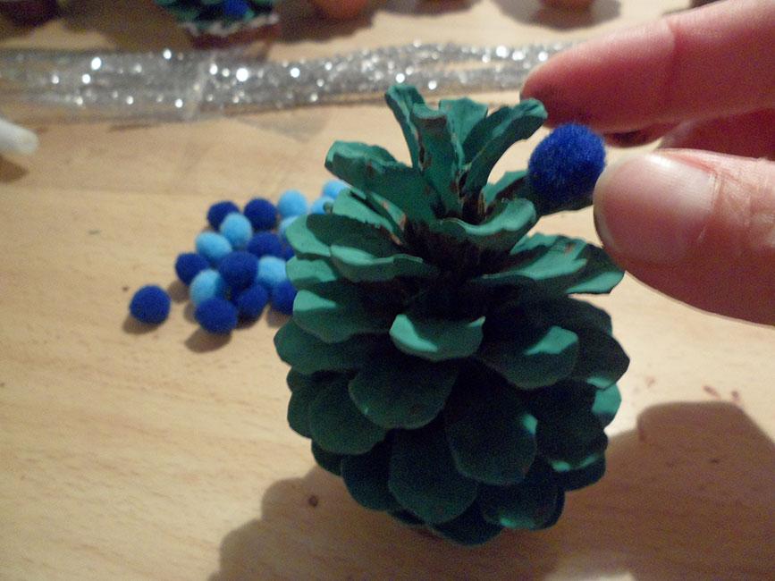 Para decorar las piñas con pompones, simplemente iba poniendo una gotita de cola en cada uno de los huecos donde iba a poner un pompón, y luego ponía el pompón encima. En nuestro caso, preparamos piñas con pompones naranjas y amarillos con elementos brillantes de color dorado y otras de dos tonos de azul (que han sido las que más han triunfado).
