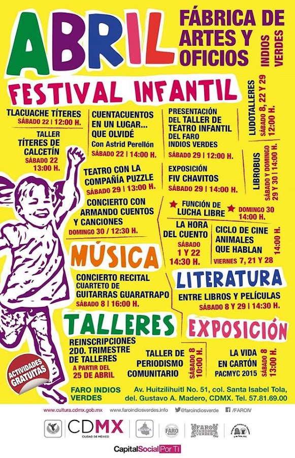 Tienen una gran oferta de actvidades y lo mejor es que no solo será un día, sino varias semanas de pura diversión. Desde Cuentacuentos, Títeres, Teatro, Músico, Talleres, Literatura, Música, Cine, Exposiciones hasta na función de Lucha Libre, todo pensado para que los peques se diciertan.