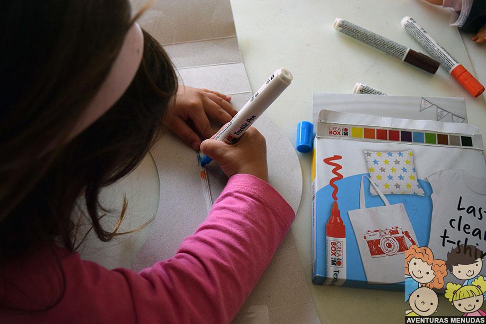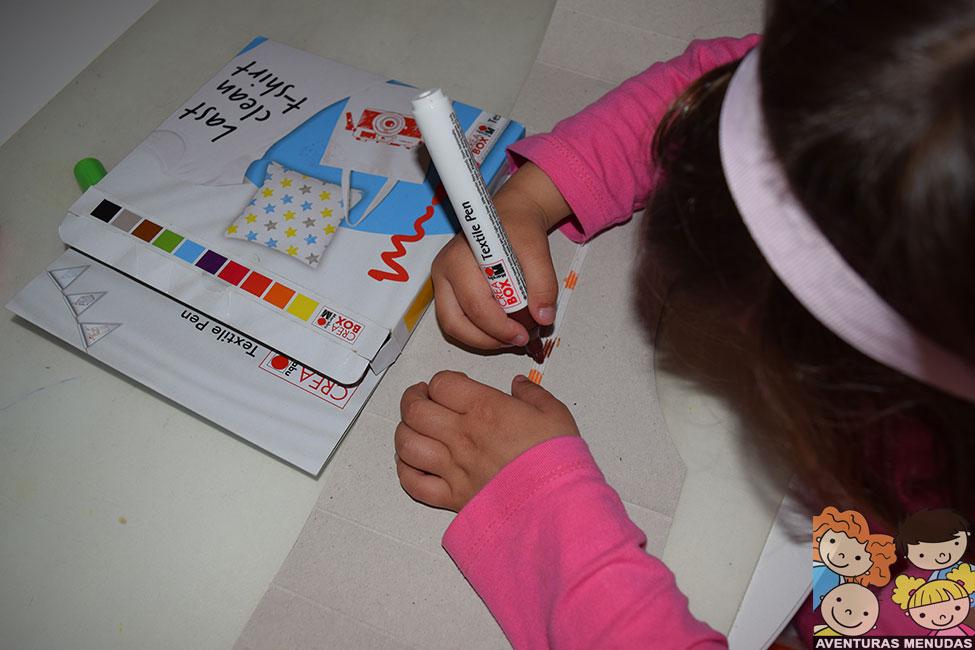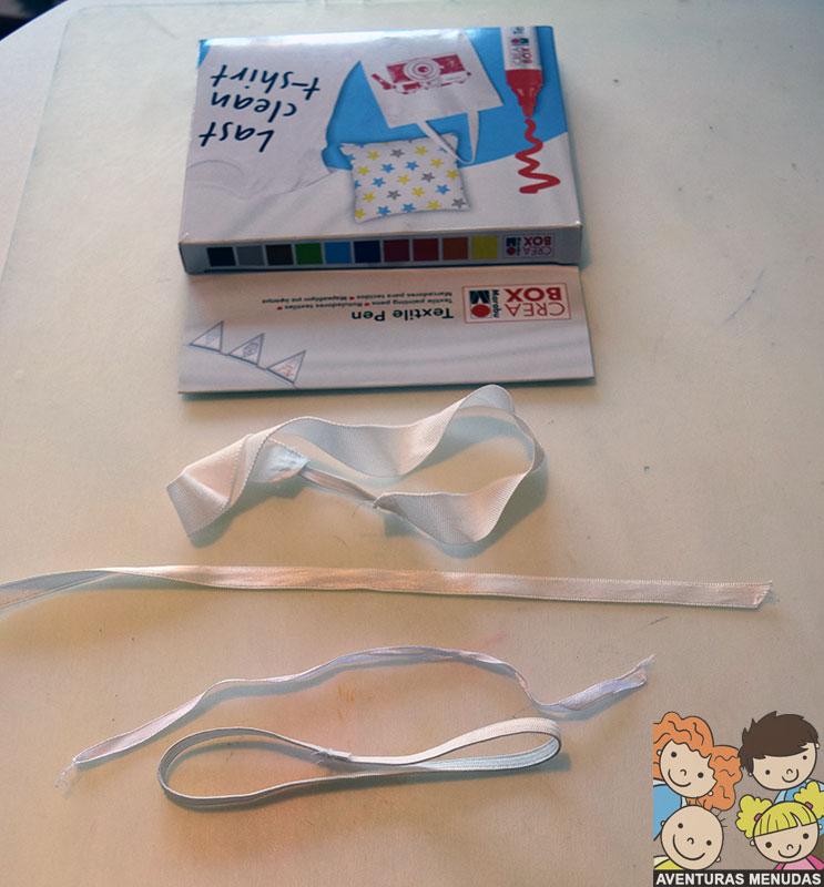 Cuando te pasa algo así lo primero, terminar de despegar los ojos y comenzar a activar las neuronas… jajaja. Cuando tu cabeza ya está en marcha, te pones a buscar los materiales que tienes por casa que pueden ayudar a hacer la diadema que te pide tu hija o hijo. Nosotros teníamos rotuladores de tela y varias opciones de cintas. En el caso de que no tengas rotuladores de tela a mano, puedes optar por rotuladores permanentes de colores o si no, probar con rotuladores normales, pero siempre dependiendo del tipo de tejido que uses para la diadema.