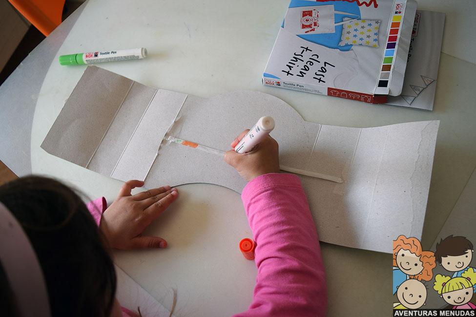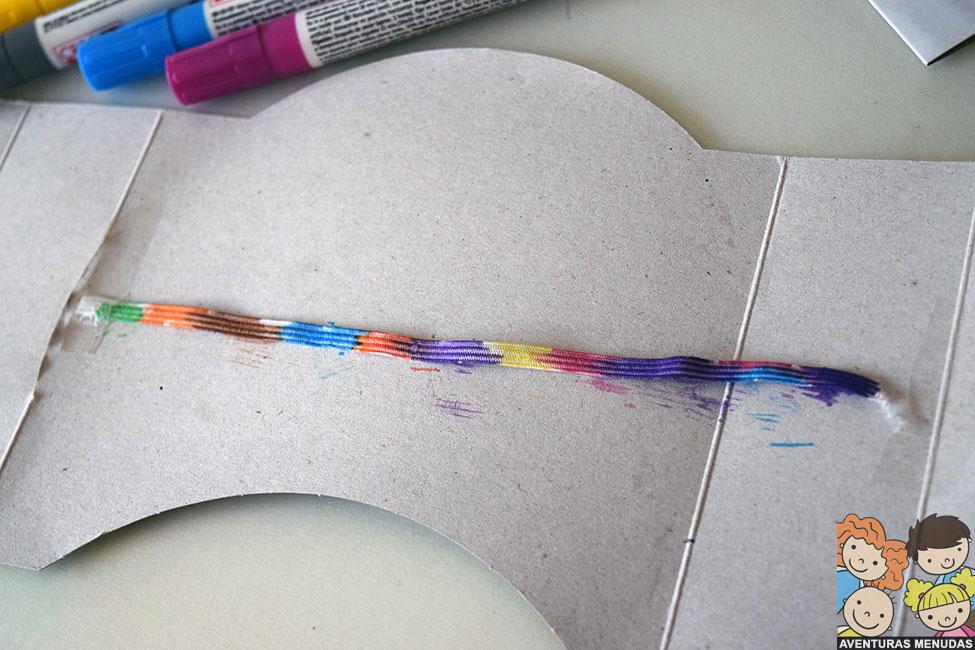 Después la dejamos secar un ratito, para que no manchara por dentro y la cosí yo con aguja e hilo. Eso es opcional, podéis usar pegamento, para que ellos sean los que terminen de crear la diadema entera o incluso algún tipo de cinta adhesiva bonita que tengáis.