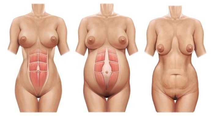 Para que nos entendamos, la "tableta de los abdominales", normalmente unida de enmedio, queda abierta, de modo que estéticamente parece que tengas barriga de embarazada sin estarlo.