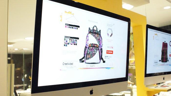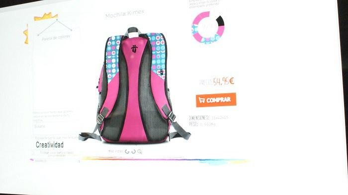 En primer lugar nos situaremos en el espacio preparado para el diseño. En la pantalla del ordenador nos aparece el modelo de la mochila a diseñar y comenzamos a seleccionar los diferentes elementos que componen la mochila para ir eligiendo los colores y el estampado. La mochila cuenta con 38 elementos (frontal, lateral, parte trasera, asas o texto ) que podemos ir modificando para crear un producto único.