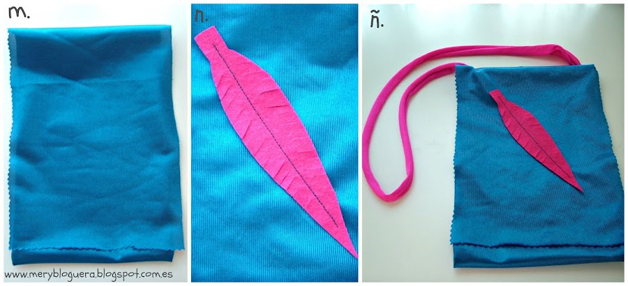 ñ. Cosemos la pluma ladeada a la tapa de la bandolera y le hacemos los cortes simulando los pelillos.