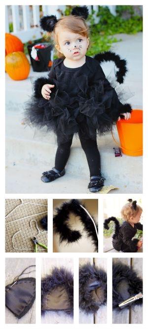 De gatita negra lo mismo, tutú negro y una camiseta/body negro. Le compramos unas orejitas en tiendas como Claires y le pintamos la nariz de negro con unos bigotes y tenemos una gatita preciosa. Para la cola de gata, podemos simplemente enrollar espumillón a un alambre y pegárselo/cosérselo al tutú.