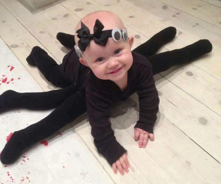 Si la idea del tutú no os gusta o tenéis un bebé que no anda, la idea de araña es muy original. Las patas podemos hacérselas con calcetines negros de adulto. Le ponemos un body y le cosemos 8 calcetines alrededor del mismo. Qué miedo da esta araña!