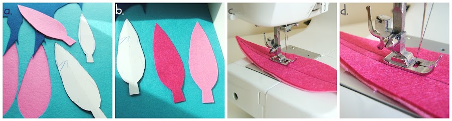 c. y d. Coserlas juntas con dos tiras de costura, la idea es "hacer un caminito" para luego meter un alambre en medio y que la pluma se mantenga erguida.
