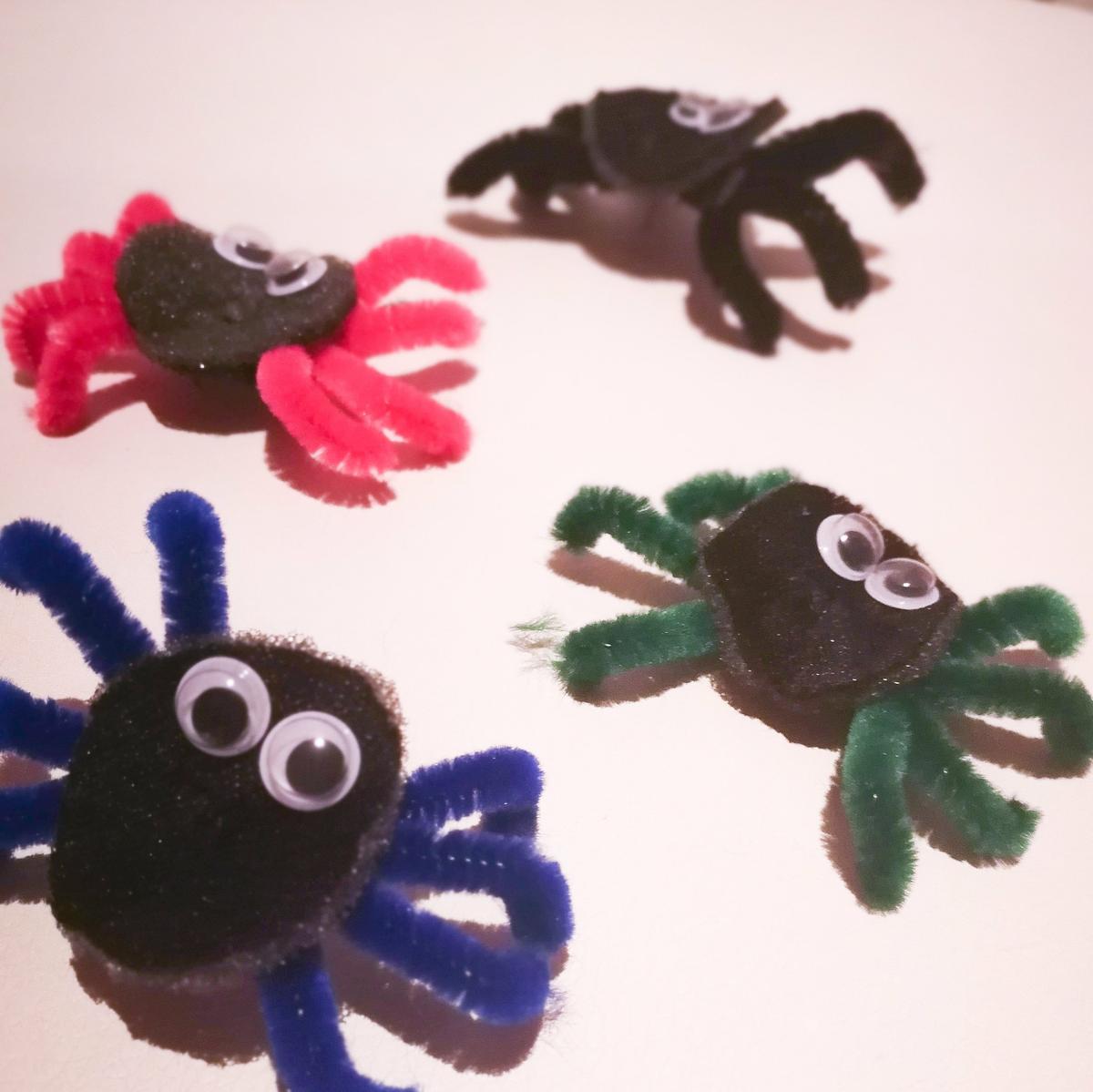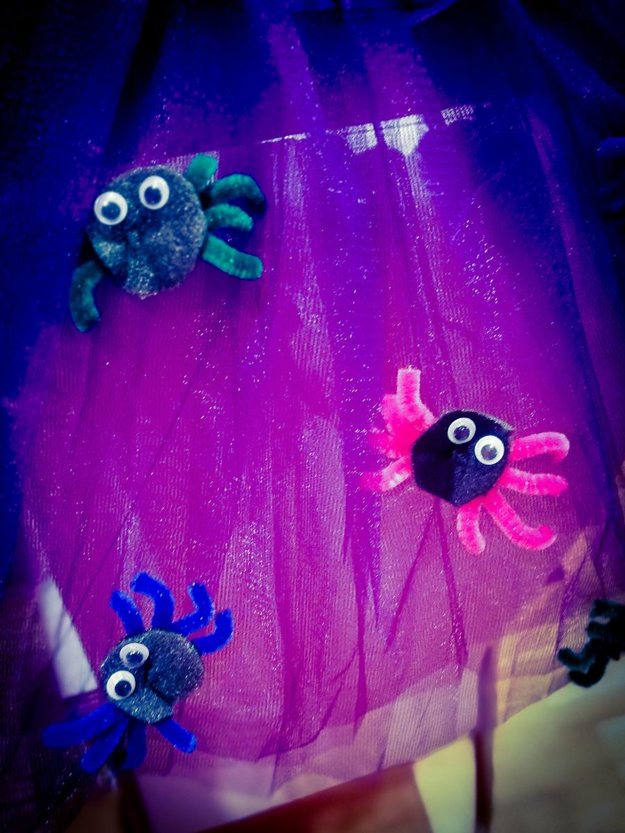 Con el cuello de mí disfraz, he fabricado el cuerpo de las arañas, las patas son limpiapipas de colores cortados en cuatro y los ojos son reciclados de antiguas manualidades… También puedes usar fieltro o goma eva de color negro y los ojos con goma eva blanca ya los tendrías.
