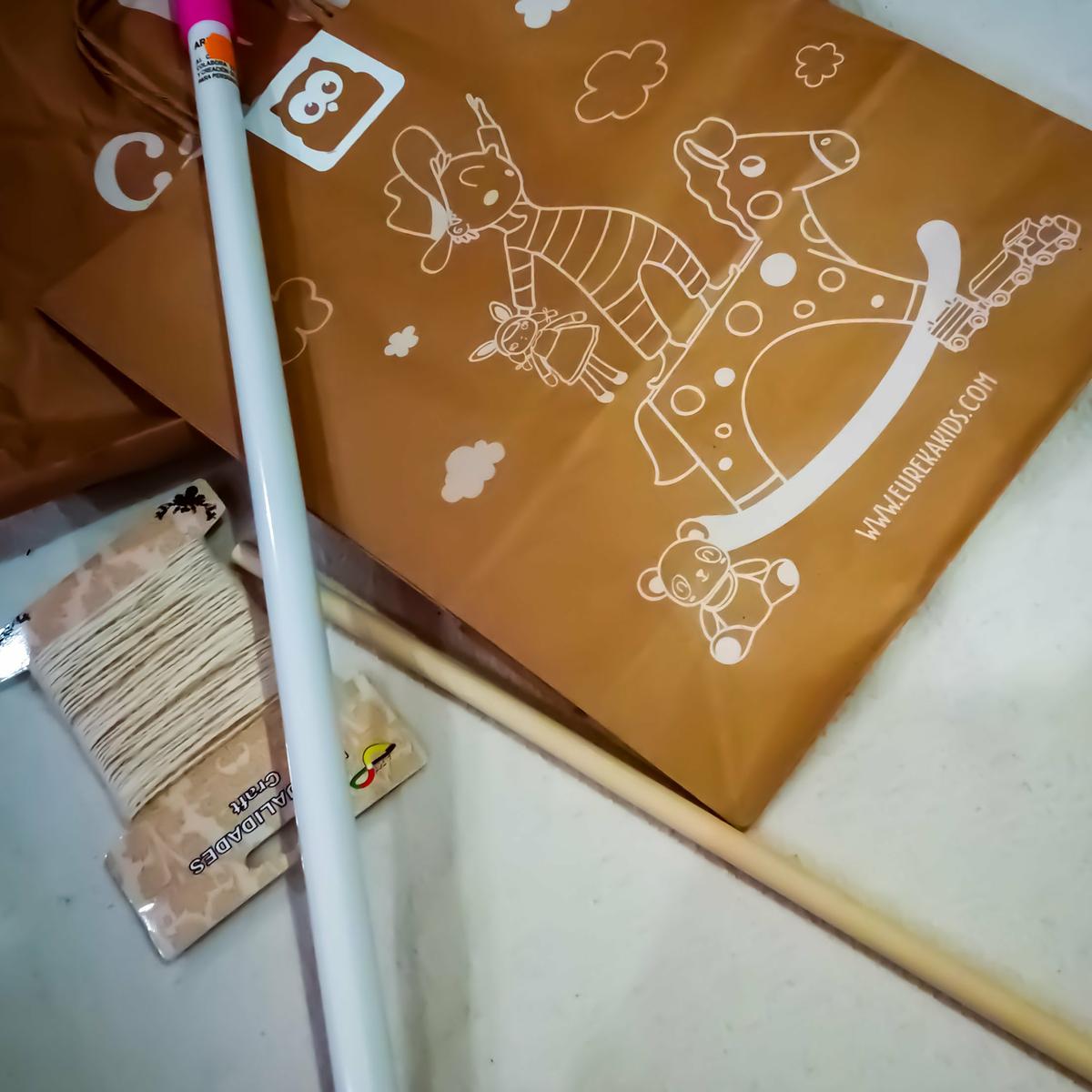 Cubre todo el palo con cinta aislante negra. Corta la bolsa de papel kraft en rectángulos y estos en tiras finitas dejando el último centímetro sin cortar.