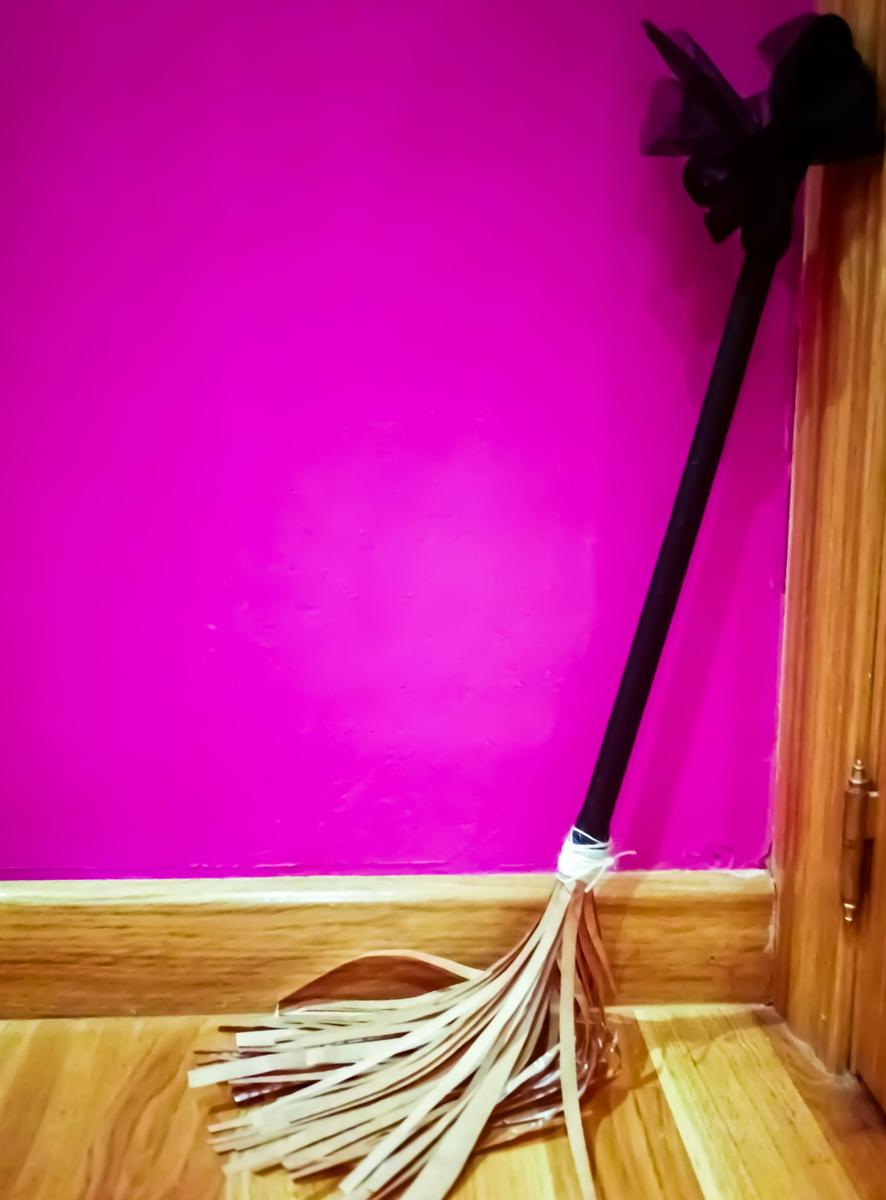 La escoba está hecha con el palo de una antigua rueda de bebés, esas que todos hemos tenido de pequeños y todos hemos odiado de mayores…