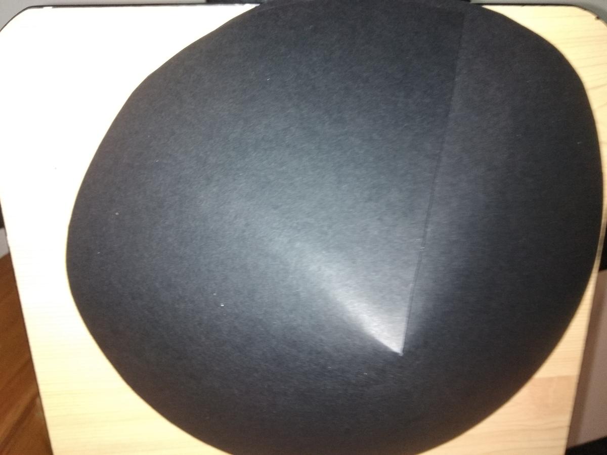 Para hacer el gorro hice un círculo en la cartulina negra (utilicé la tapadera de una cazuela grande, piensa que tiene que ser mayor que el diámetro de la cabeza del niño. Tras recortar el círculo corté un radio y lo pegué para que tuviera esa forma de cono tan característica. hice dos agujeros con un punzón y le puse una goma elástica fina para que sea más cómodo.