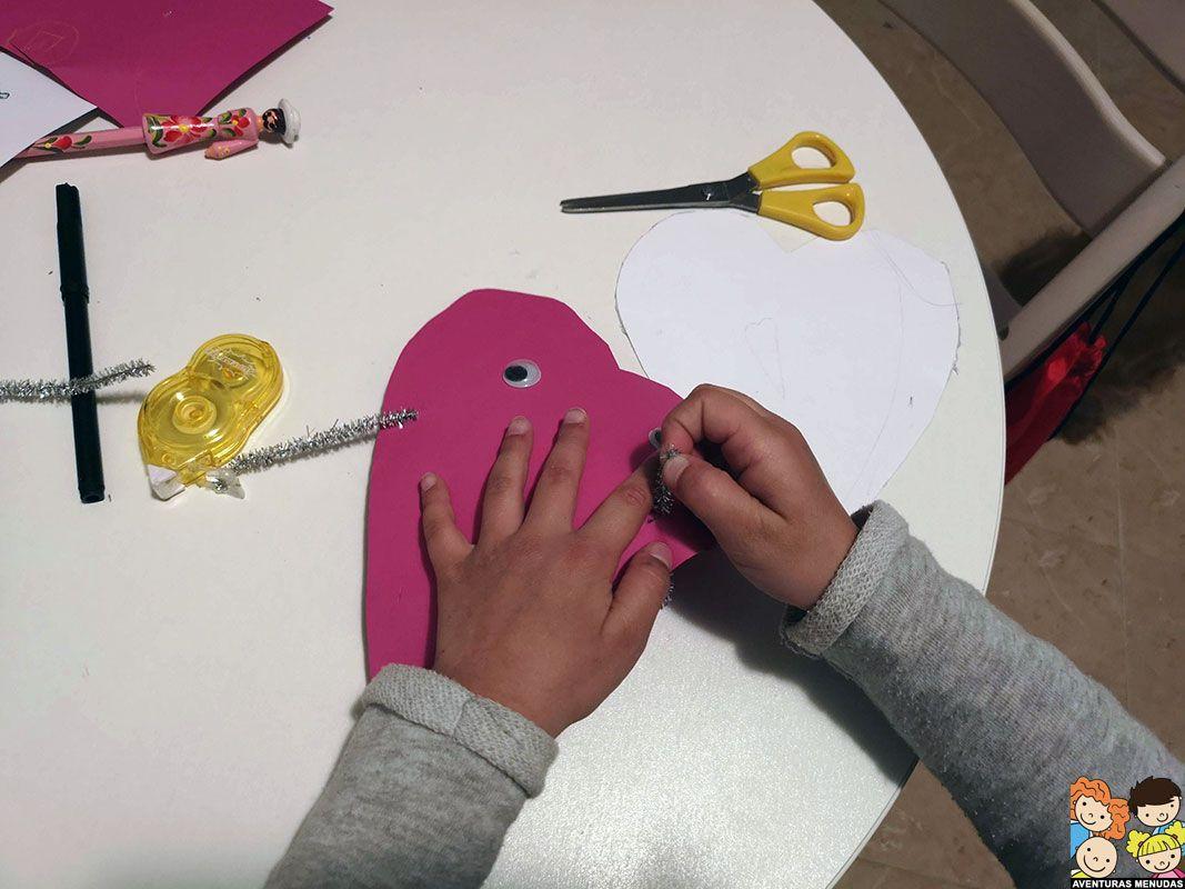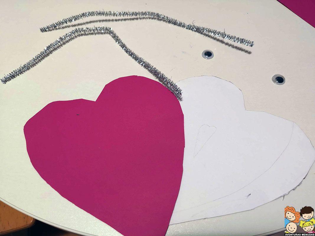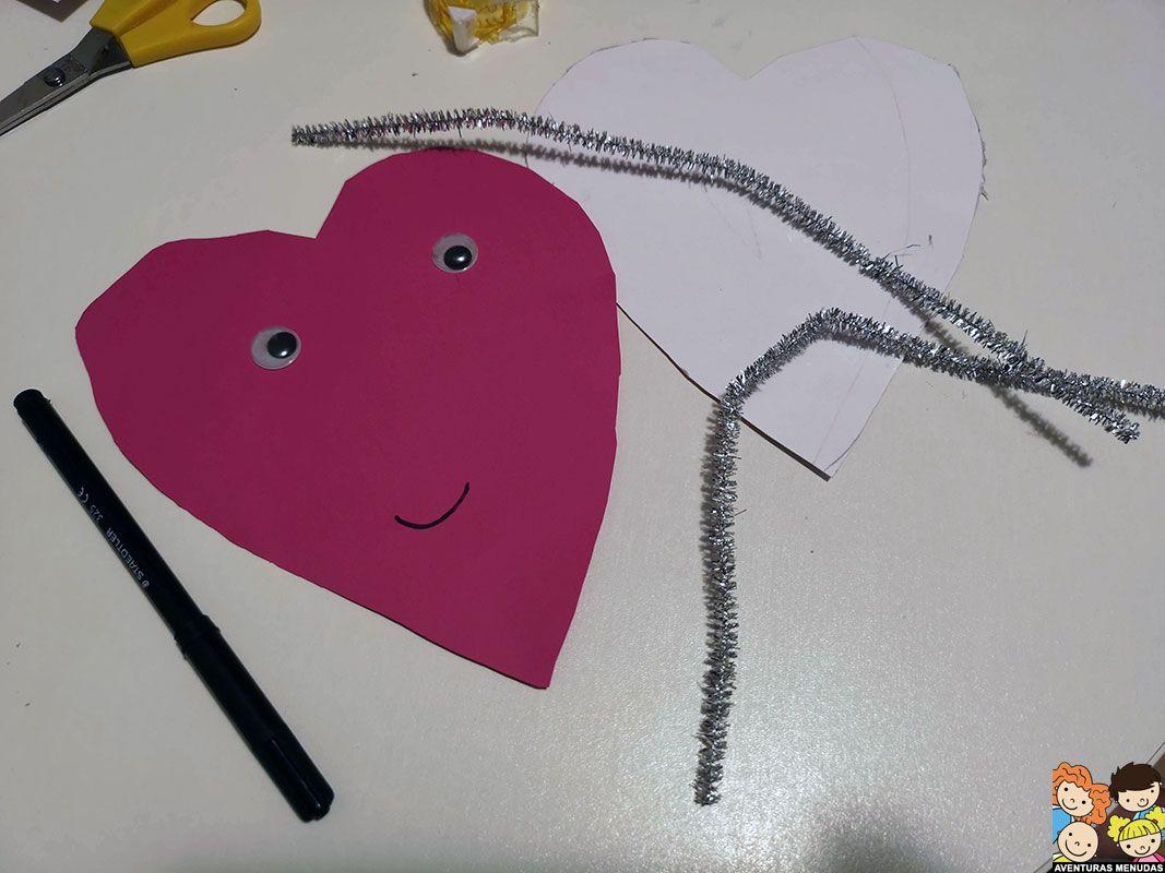 Ponemos pegamento al otro corazón de cartulina y lo ajustamos por detrás del que ya está montado, tapando la parte de los limpia pipas que quedan por detrás.