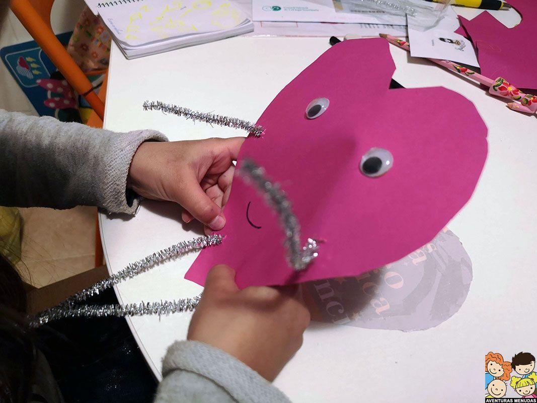 Necesitáis, cartulina, tijeras, limpia pipas, ojos móviles y pegamento. Ah! Y un rotulador para dibujar la boca.