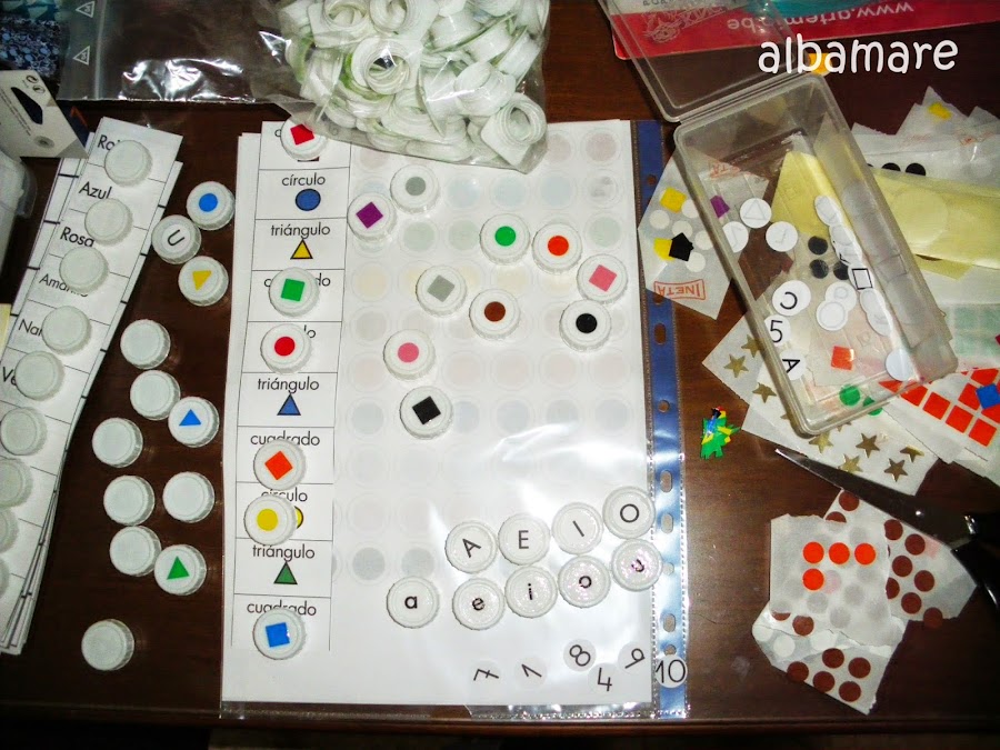 Preparamos nuestros tapones recortando de las plantillas con la troqueladora y pegando con silicona líquida. Ponemos un poco debajo del papel y cuando se haya secado le ponemos otra mano por encima para plastificar y se pueda manchar, mojar, chupar y todas esas cosas que hacen los peques, jeje.