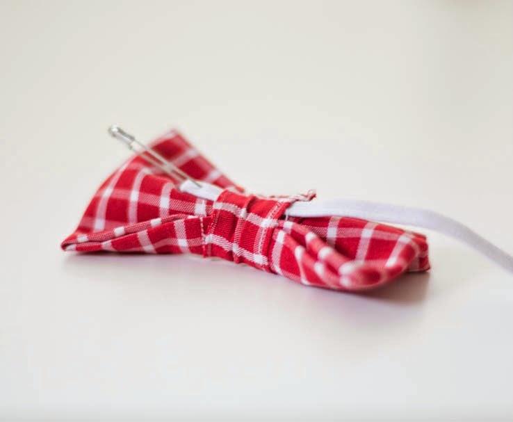 Con la ayuda de un imperdible, pasaremos la goma elástica por detrás de la pajarita y coseremos los extremos a la medida deseada. Y ya está, ya tenemos nuestra pajarita.