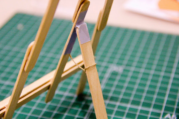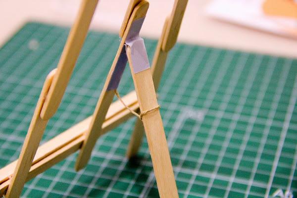Le enganchamos con washi y un nudito un trozo de cordel del palo que hace de caballete al palo central.