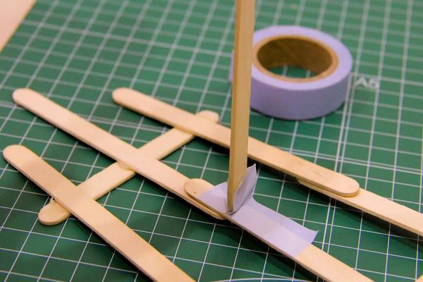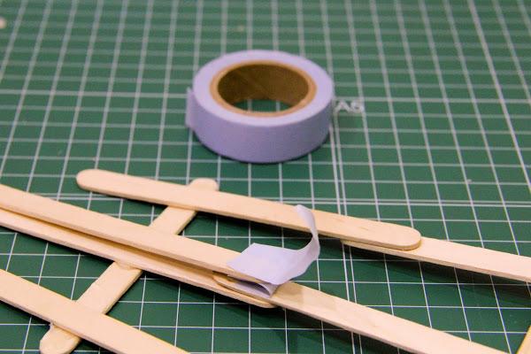 Lo pegamos con un trozo de washi por un lado y por el otro al palito largo del centro de la estructura.