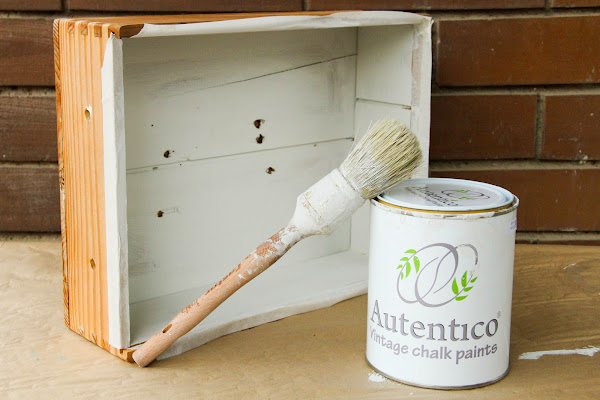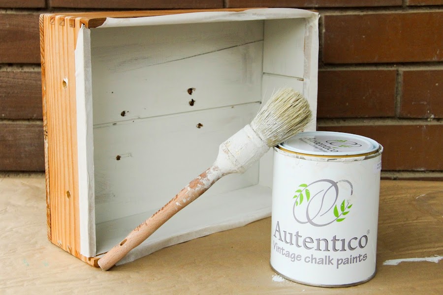 Hasta ahora había plantas y por eso tiene esos agujeros, para el riego... pero como la madera del exterior se conservaba bastante bien, decidí aprovecharla y darle un lavado de cara pintando con chalk paint sólo el interior.