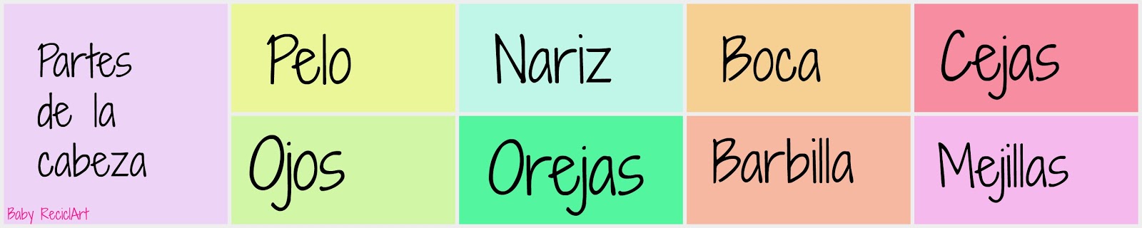 La cabeza por una parte, en la que he sacado los nombres; pelo, ojos, cejas, nariz, boca y orejas.