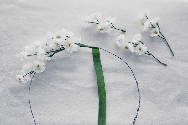 Esta es la primera florecilla que pegamos al alambre. La técnica es muy sencilla: hemos cortado pequeñas ramitas con 2 0 tres flors, y con un pedazo de floratape, lo vamos pegando al alambre. Cuando ya hayamos pegado la primera ramita, vamos apor la segunda, y así hasta completar la corona... ¡Laborioso pero fácil!