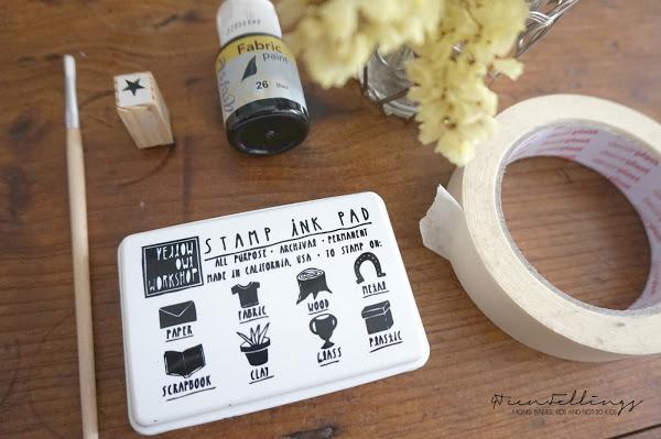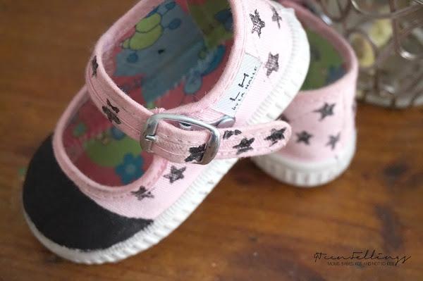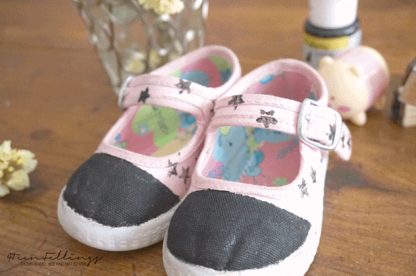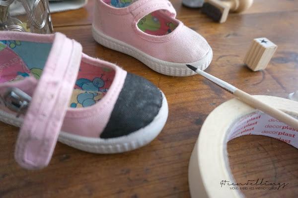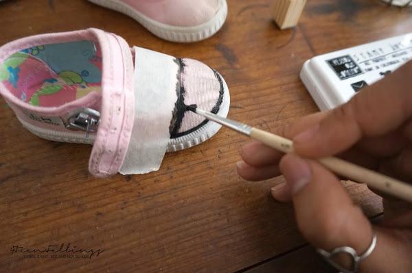 La puntera que es lo que mas sufre, la hemos pintado toda de negro y para el resto, con el mismo pincel empapar el sello que escojáis y estampar por el resto del tejido.