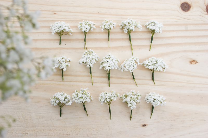 3. Lo siguiente es preparar pequeños ramitos de paniculata atada con floral tape. Muchas floristas lo hacen con alambre fino, pero a nosotros nos pareció más fácil hacerlo con floral tape...