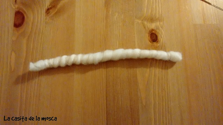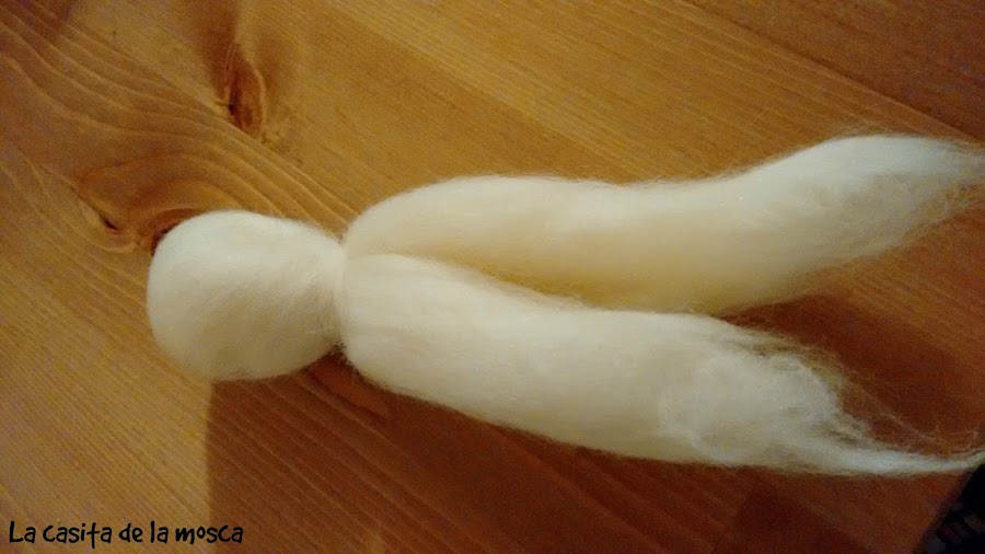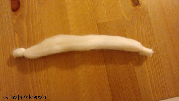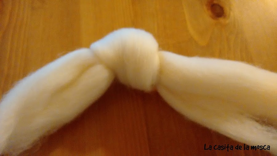 En primer lugar, coge un trozo de lana cardada blanca de unos 50 cm de largo, y unos 7 cm de ancho y haz un nudo por la mitad, ese nudo será la cabeza, elige la parte que está mejor para que se vea por delante.