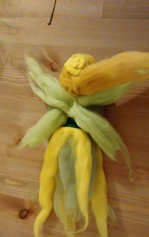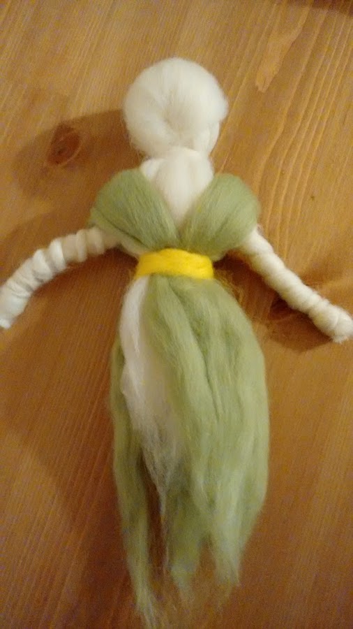 Luego se viste al hada como más te guste. Tu eliges los colores, etc. En mi caso he cogido lana peinada de color verde. Para hacer el vestido, se forma un hueco en medio del trozo de lana que hayas elegido para poder meter la cabeza y marcas de nuevo la cintura.