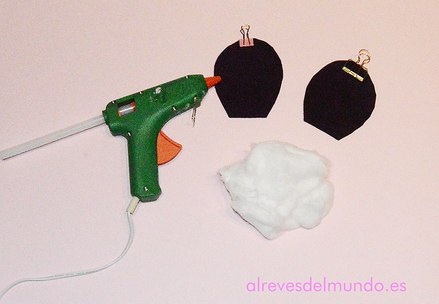 - Pegamos todo el lateral de afuera con silicona; lo pegamos por el interior por lo que las orejas hay que pegarlas a los dos trozos de fieltro blanco, cada una por su lado