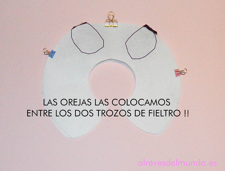 - Colocamos entre los dos trozos de fieltro blanco, las orejas como indica el dibujo.