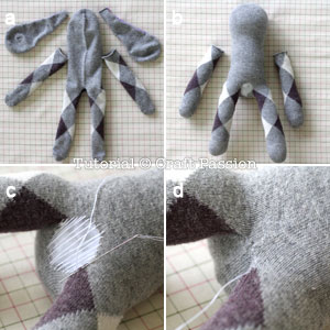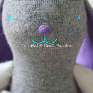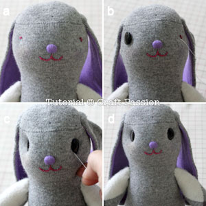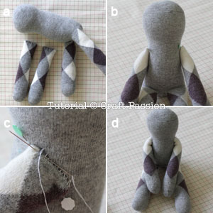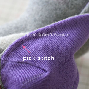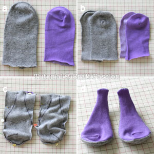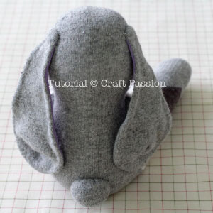 4. a) para coser las orejas largas del conejo tendrás que usar la parte del pie de los calcetines, como ves la gris, la parte externa de la oreja, será un poco más larga que la interna.