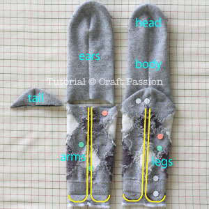 Como ves la parte de las piernas y brazos del conejo será la parte del calcetín de colores.