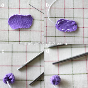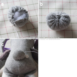 10. Recorta una pequeña zona del calcetín pequeño para hacer la nariz. Un truco para hacerla redonda es cortar la pieza en forma de elipse, darle unas puntadas alrededor como la foto b, luego estirar del hilo y quedará redondita.