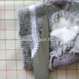 b) recorta cada calcetín por la mitad para lograr dos mitades, y por tanto dos orejas.
