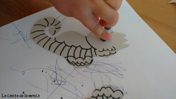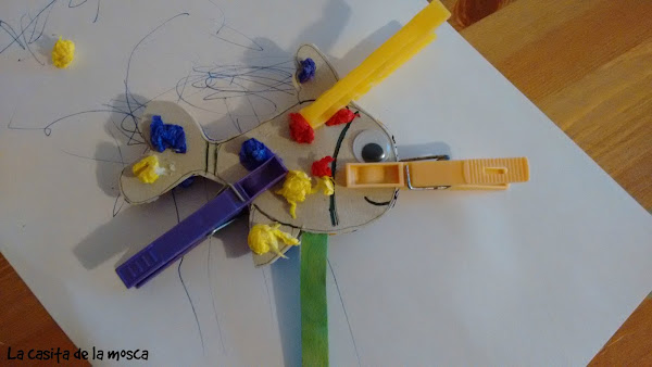 Como puedes ver en la foto tienes que dibujar y cortar las dos partes iguales para luego pegarlas con el stick en medio. Para que se unieran bien nos ayudamos con unas pinzas de tender la ropa para hacer presión. Aunque, además de pegarlas también les puse un par de grapas, para asegurar que no se despegaban fácilmente ;)